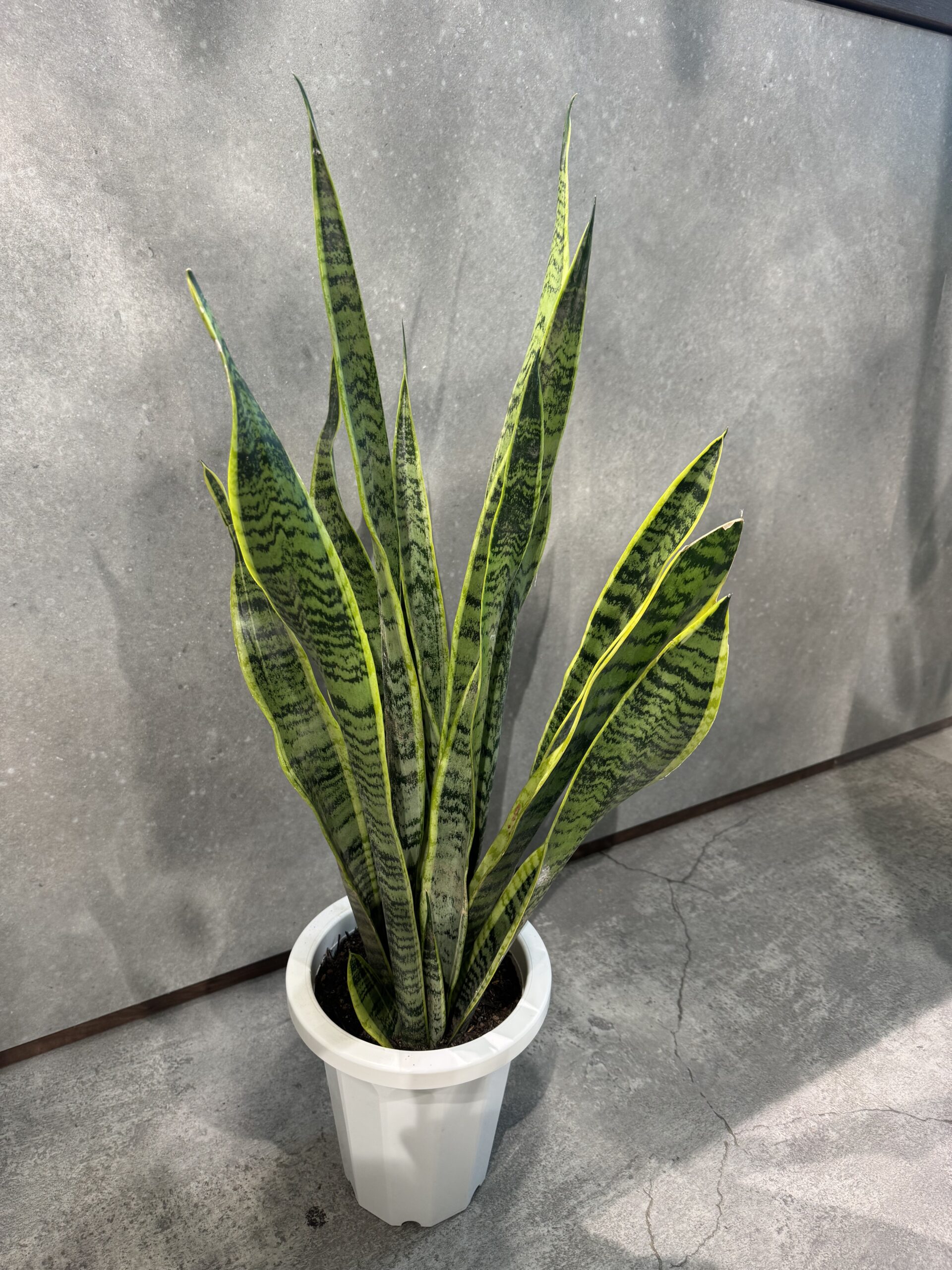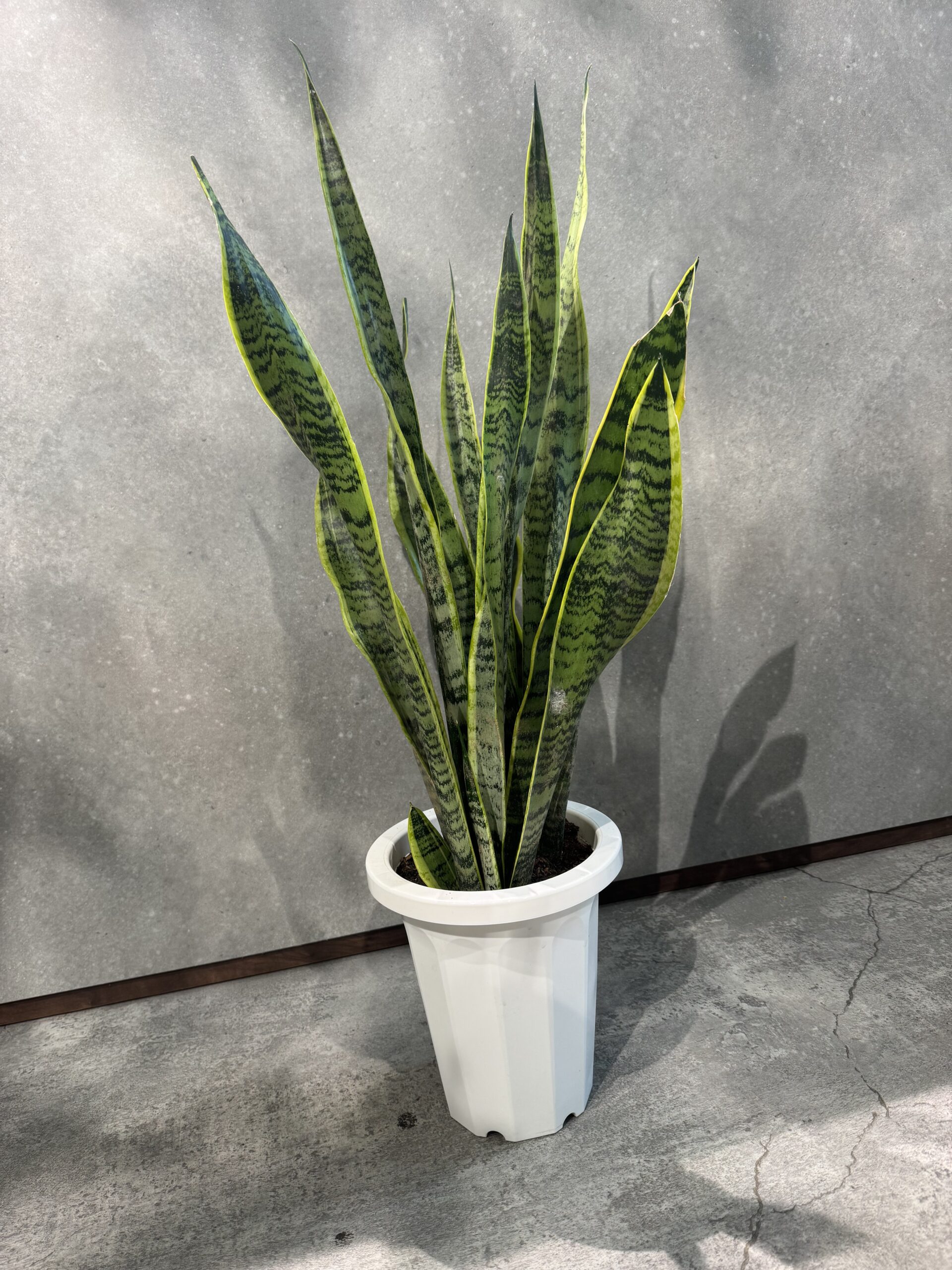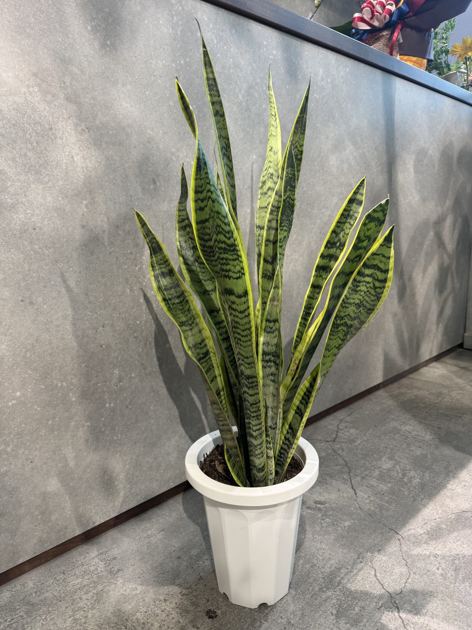 剣のような硬い葉が特徴の乾燥に強い多肉植物です。高い空気洗浄効果とマイナスイオン放出が知られ、風水では魔除け・運気アップのインテリアとしても人気です。 高さ鉢含め約85㎝