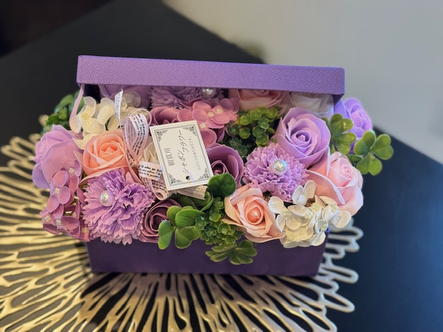 香りはきつくなく、お顔を近づけていただくとほのかに石鹸の優しい香りが広がります。 香りの持続性は環境にもよりますが約3カ月~半年間です。 もちろん香りがなくなった後も観賞用として長期間お飾りいただくことができます。 サイズ:横幅約20㎝、奥行き約15㎝、高さ約16㎝